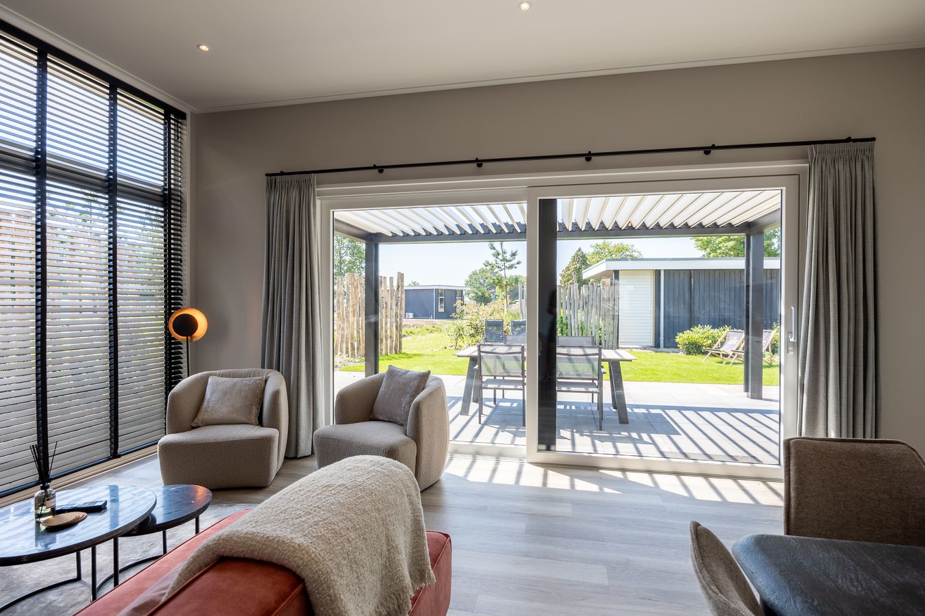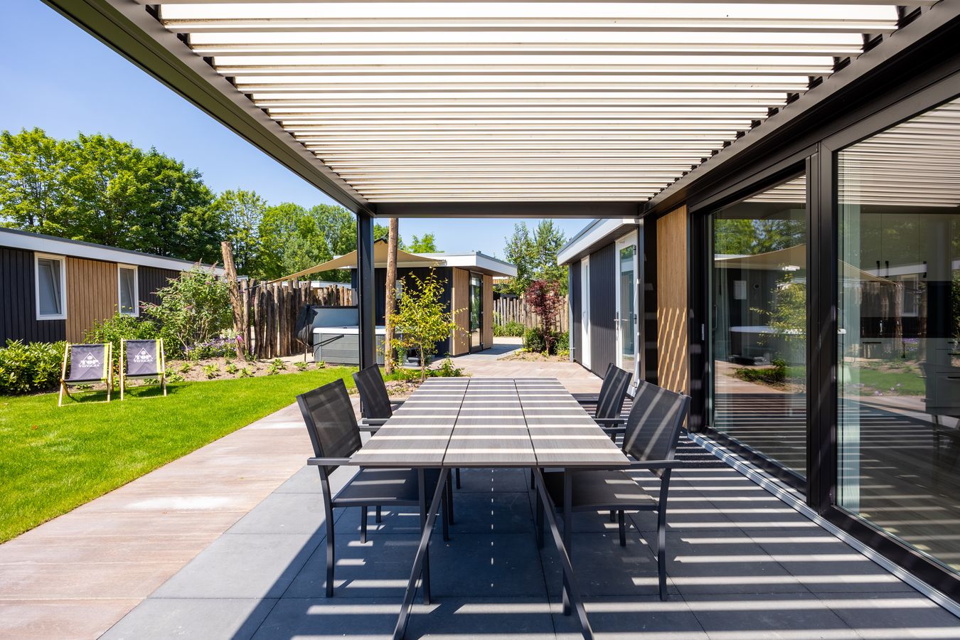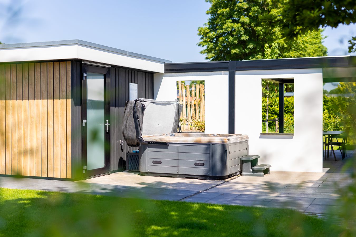 You can also enjoy yourself outside, thanks in part to the terrace with its attractive louvered canopy. A wonderful place to relax all day and evening. Be sure to make use of your own private outdoor spa; what a luxury! You can park your car next to the house. Nice and convenient. And the Wi-Fi? That’s completely free.